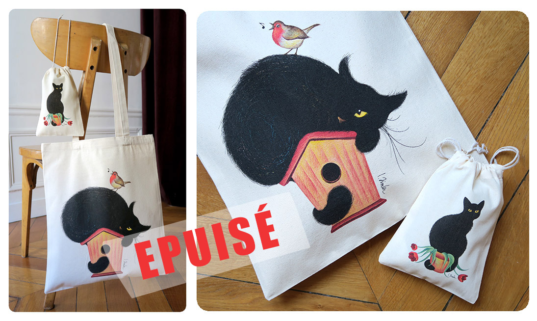 Tote bag CHAT Oiseau en coton épais 310g Taille : 42x38cm - 15€ HT - 18€ TTC.